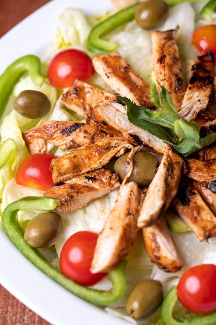 سالاد دو نفره، شامل: کاهو، گوجه، زيتون، فلفل دلمه، کدو، مرغ کبابي (با مرينيد دودي و سير)، کنجد، نان تنک و سس لبني(ماست، سس باربيکيو، سرکه بالزاميک، خردل، ادويه)
